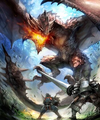 « LE Rathalos, presque impossible à tuer ». Attends, quoi ? C’est quoi ces chasseurs en carton, là ? Ils bloquent sur un rathalos ?!?