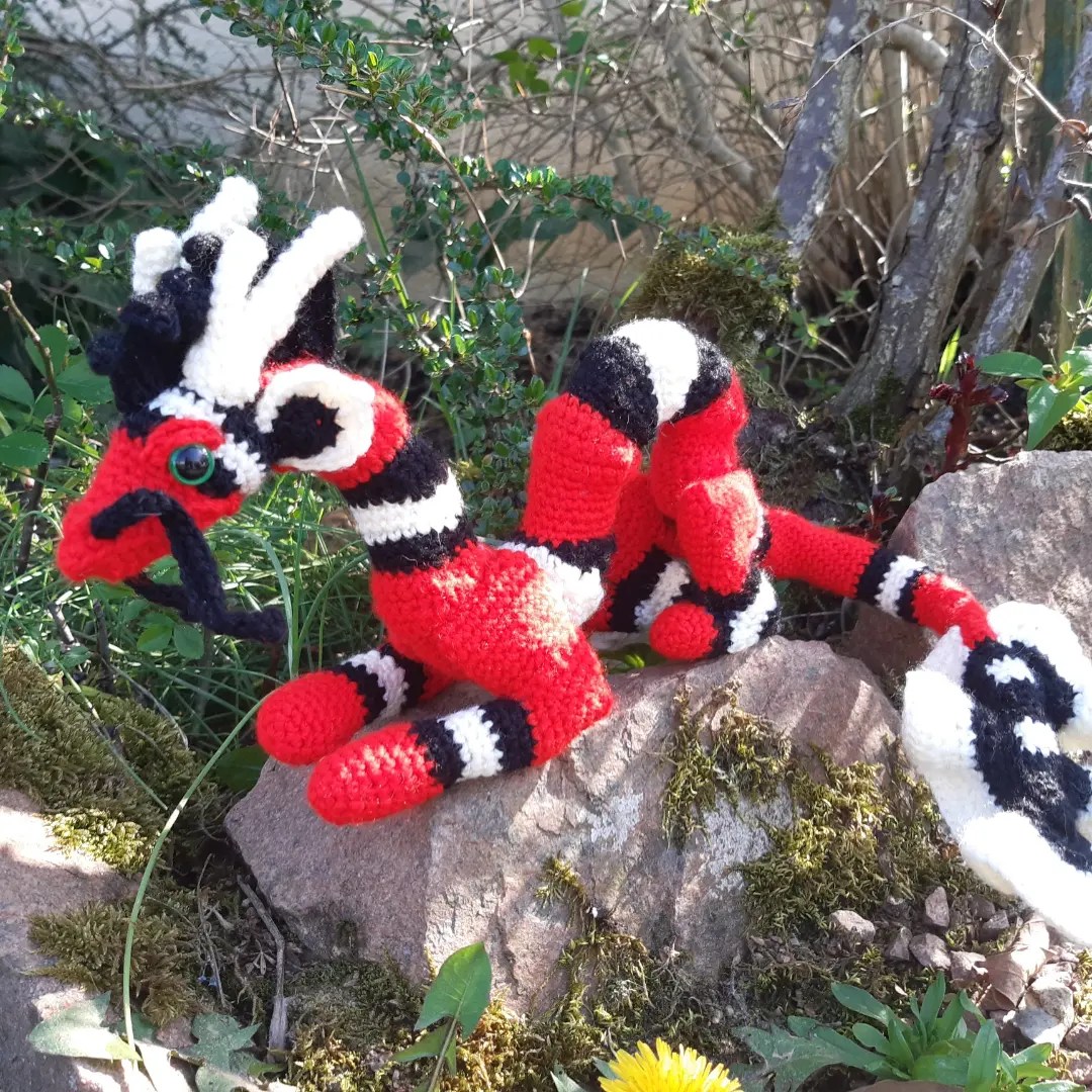 J’adore les serpents, mais pour diverses raisons je n’en ai pas, même si j’aimerais bien en avoir un jour. Du coup pour mon premier dragon oriental, j’ai choisi un motif de serpent faux corail, espèce non venimeuse à ne pas confondre avec le serpent corail 😉 Pour la queue, je suis partie de l’idée que c’était un dragon d’eau douce, et j’ai essayé de lui trouver quelque chose qui se rapproche de serpents marins et des anguilles.