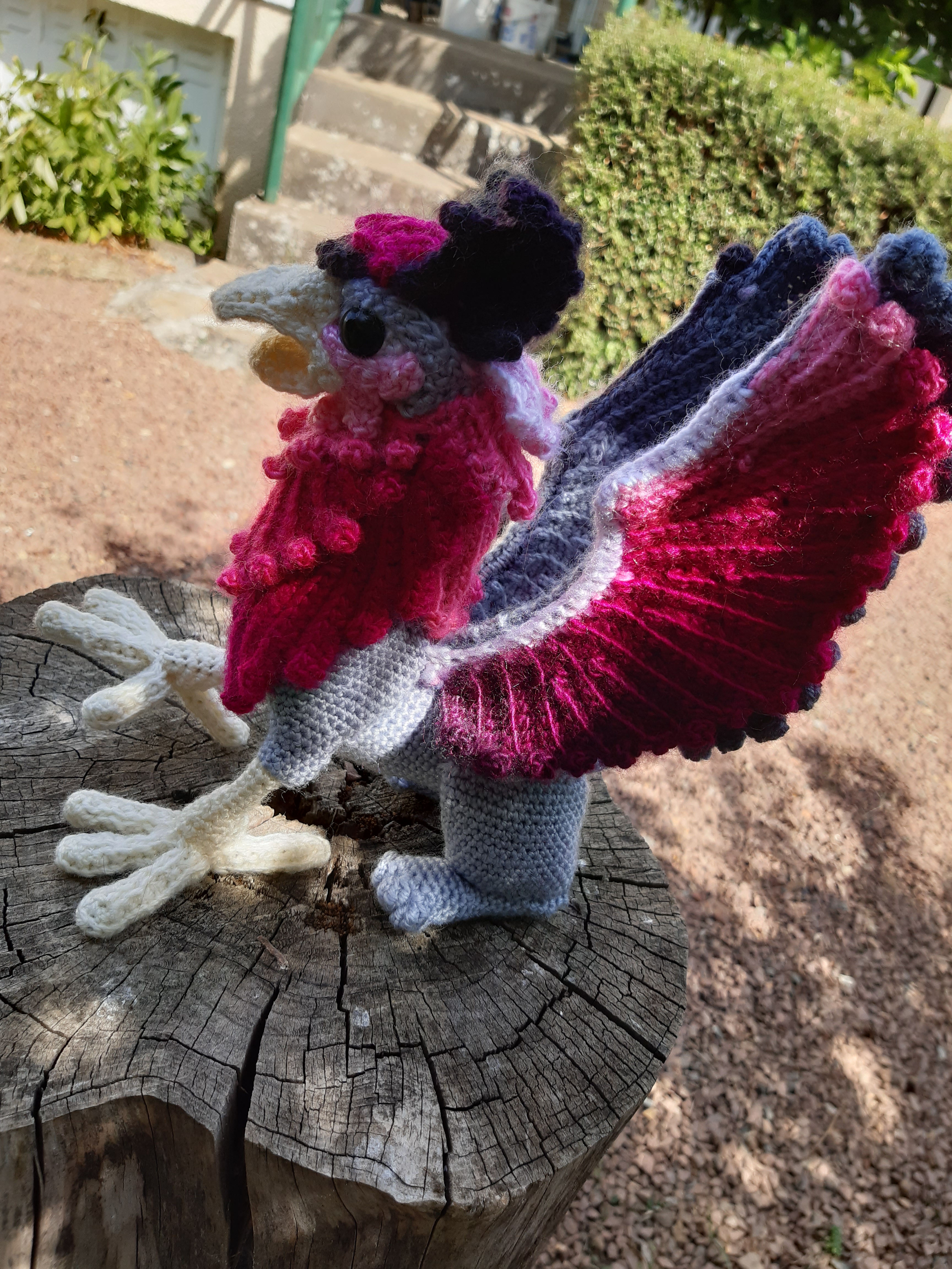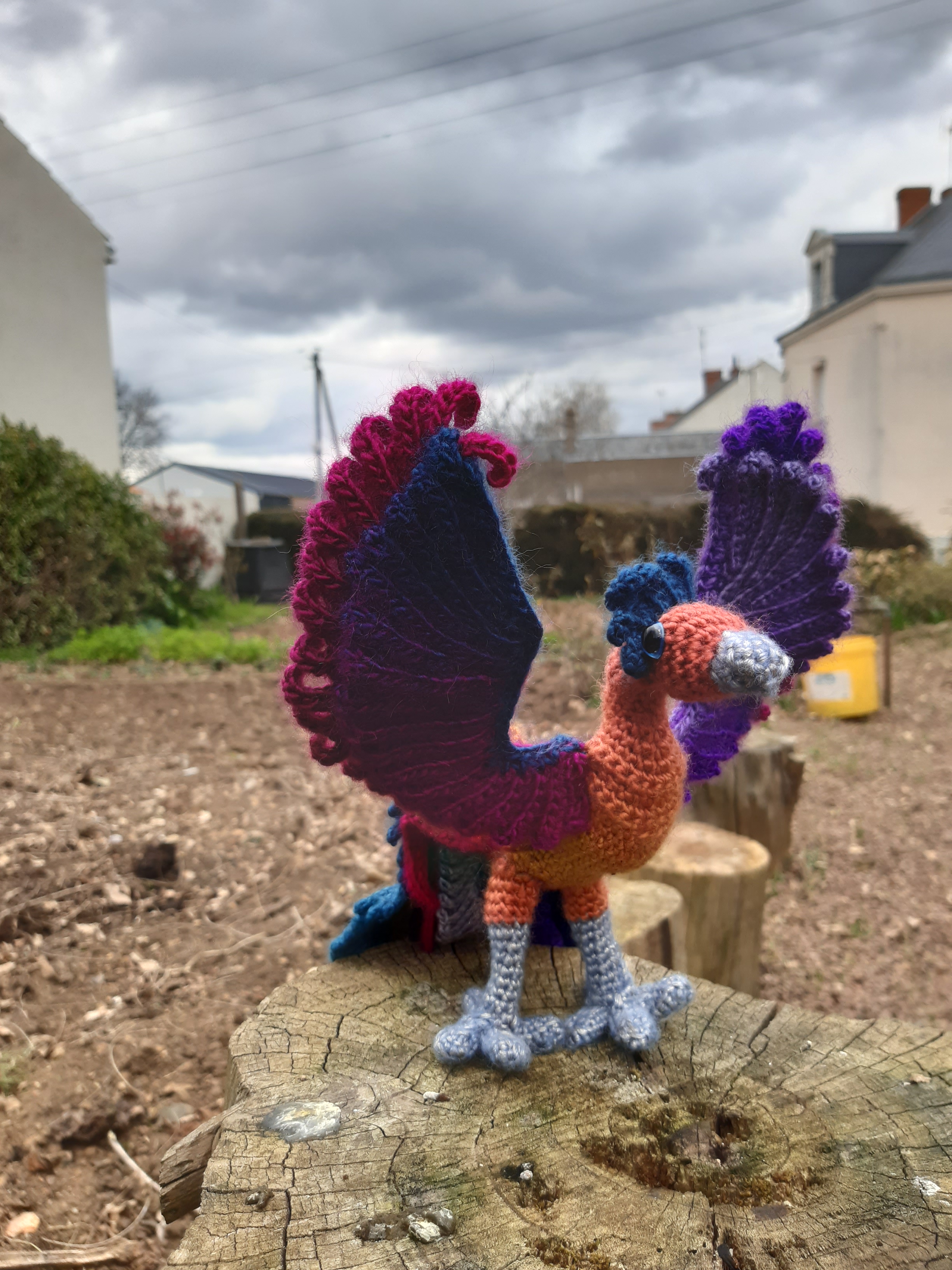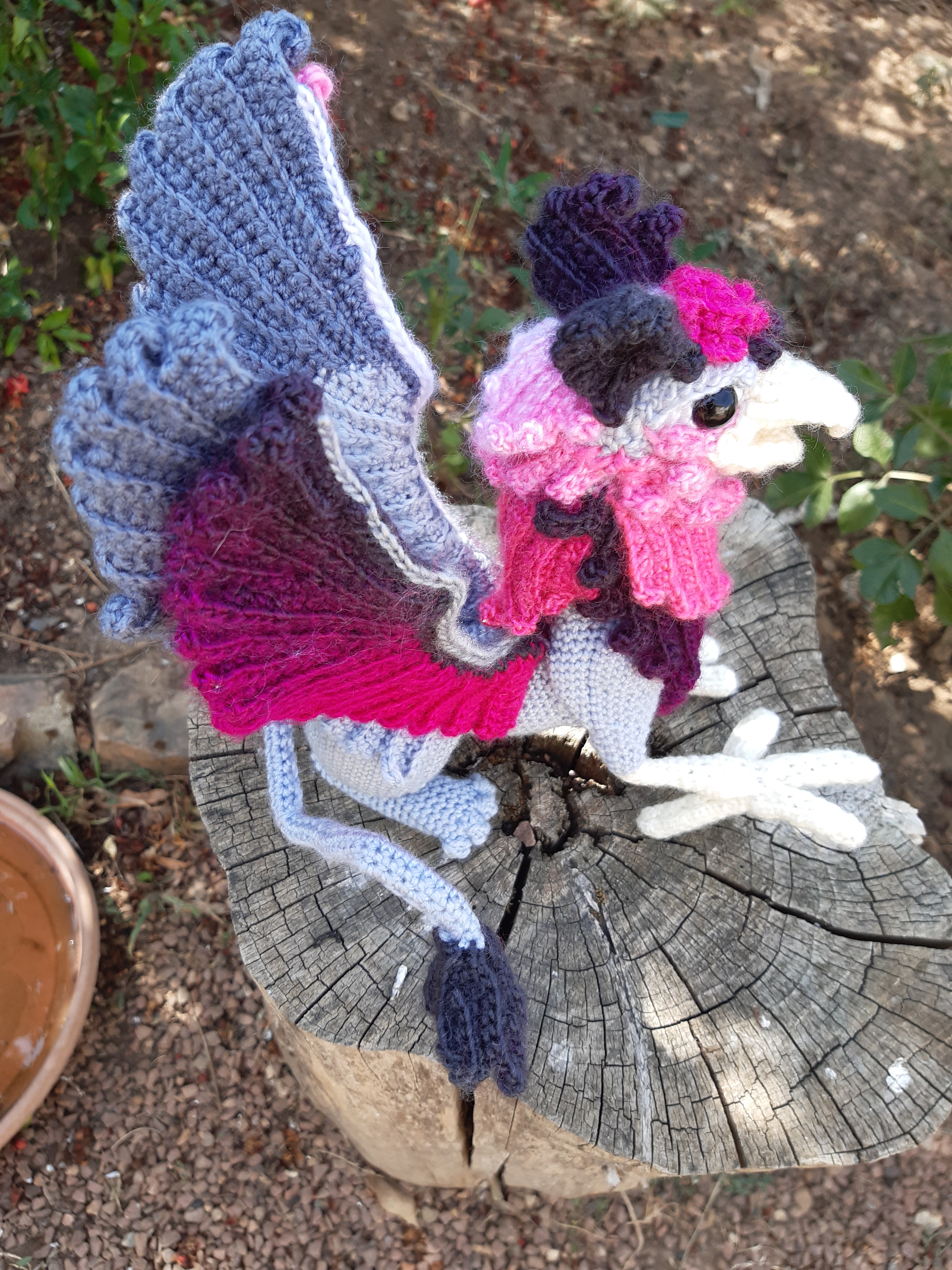 Et voilà le phénix détrôné ! Pas mal de travail sur ce griffon, et surtout au niveau de l’armature métallique qui empêche notamment les ailes de se casser la figure. Pas mal de pièces à coudre, aussi, qui n’est pas la partie que je préfère. Mais j’aime beaucoup les résultats, et ce pattern a été très formateur.