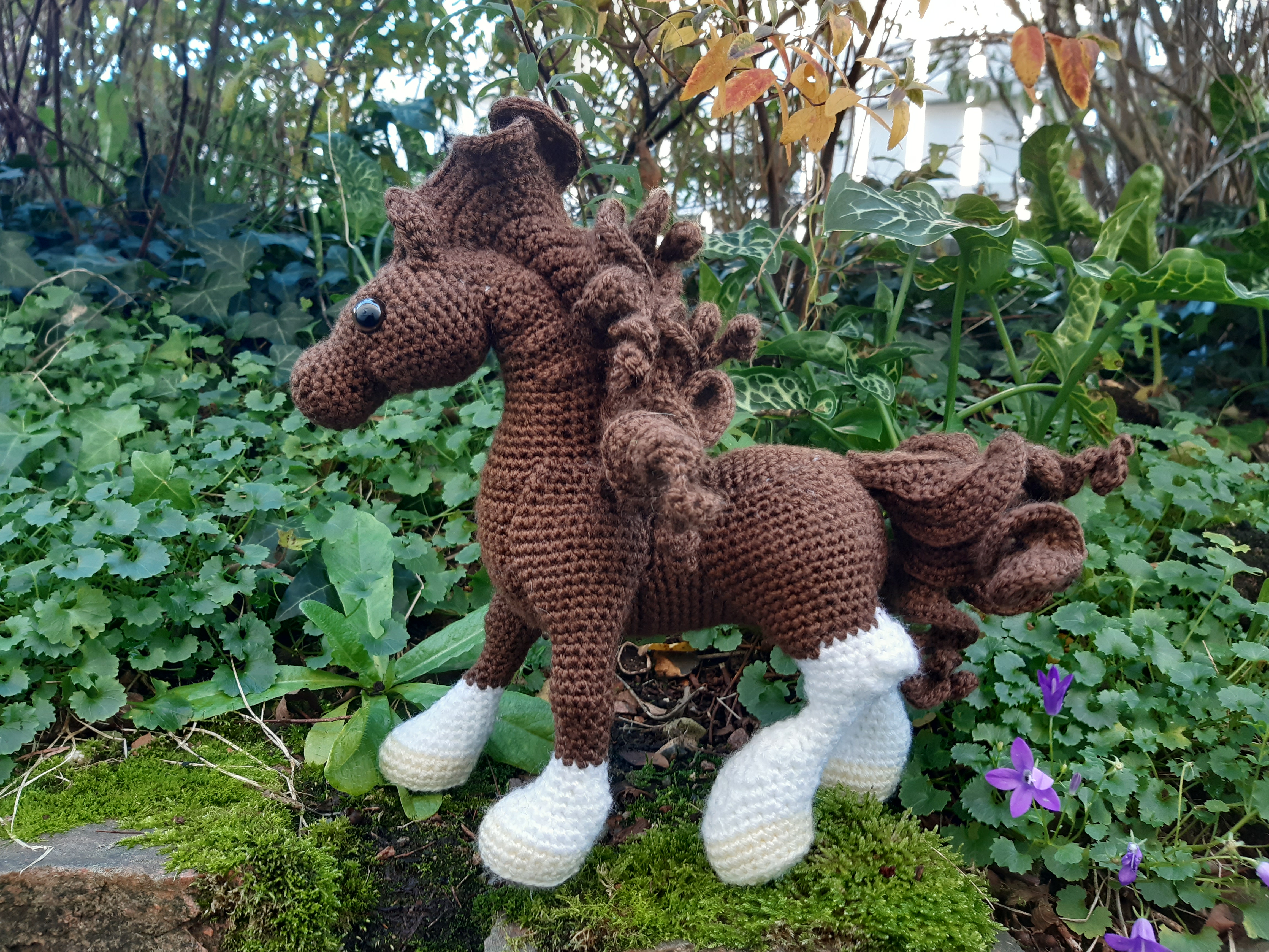 • Cheval bai et blanc (pattern Crafty Intentions) : ce pattern est relativement long même si pas très compliqué, mais j’aime beaucoup sa versatilité vu les options de jambes. Les deux que j’ai fait sont à offrir à des proches, mais j’espère que j’aurai l’occasion d’en refaire 🙂