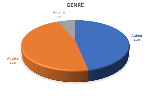 - Bonne partialité, avec 47 % d’autrices, 47 % d’auteurs, et 6 % d’autaires non-binaires.