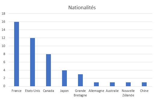 - 9 nationalités d’auteurices représentés, avec une prédominance pour la France, les USA et le Canda.,