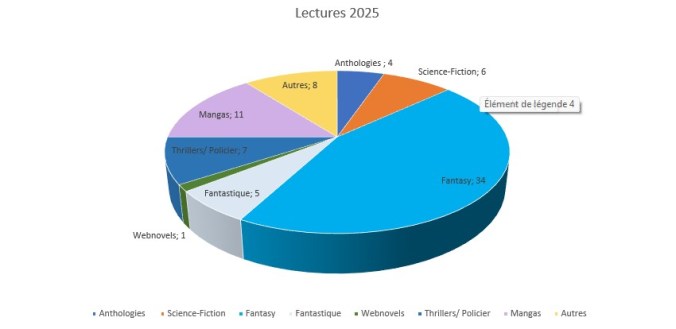 76 lectures en 2025, dont seulement 11 de mangas (je ne sais pas pourquoi, je ne suis pas trop mangas en ce moments, c’est généralement par périodes), et toujours une majorité de Fantasy, évidemment.