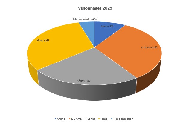 En 2025, j’ai regardé très peu de films/séries etc., et je suis aussi très en retard dans mes publications d’avis, donc je n’ai parlé que de : 7 K-Drama, 2 saisons d’anime, 8 films dont 1 film d’animation, 5 saisons de séries.